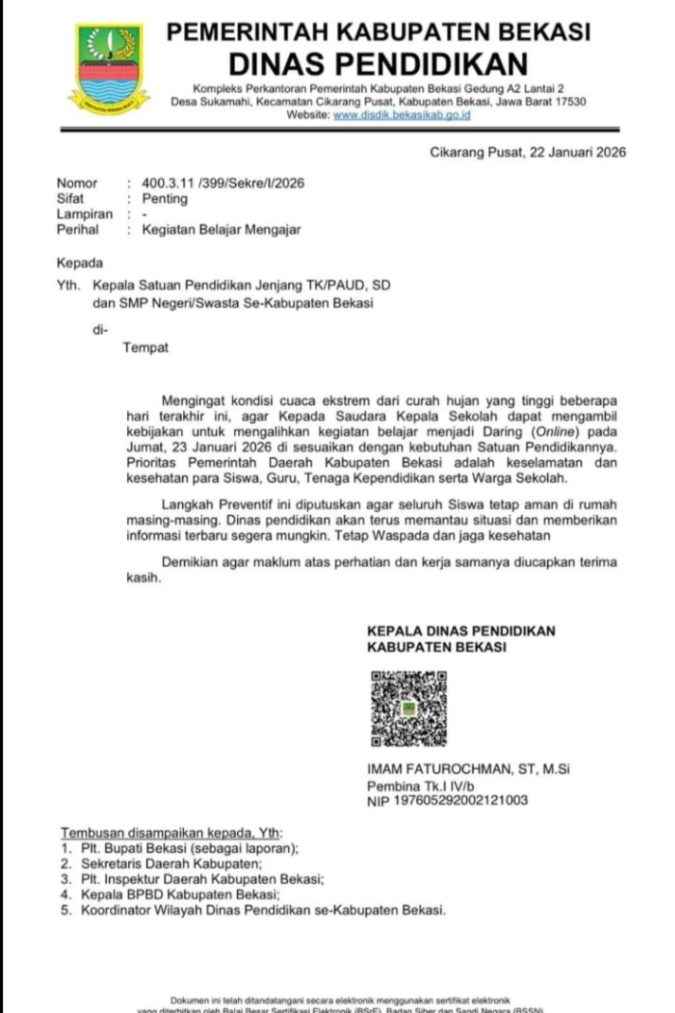 Kebijakan Surat Edaran dengan Nomor 400.3.11/399/Sekre/I/2026, Sifat Penting, Perihal Kegiatan Belajar Mengajar, yang ditujukan kepada Kepala Satuan Pendidikan Jenjang, PAUD, SD dan SMP untuk lakukan pembelajaran jarak jauh pada Jumat, 23/01/2026.